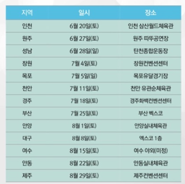 그리고 6월부터 그리고 8월29일 제주도를 마지막으로 이 전국투어 콘서트를 마친다고 하는데요. 이렇게 많이 하게 되지만 자신의 지역이 아니더라도 인근 지역의 콘서트가 열리게 되면 경쟁이 치열할수가 있으니 정말 잘 그리고 빠르게 예매를 해야하지 않나 싶어요.
