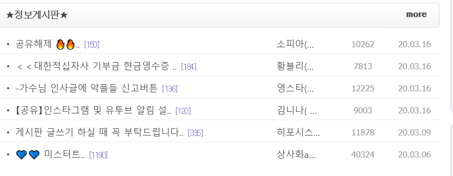 특히나 현재 새벽에 제가 이글을 쓰고 있지만요. 특히나 자유게시판의 글리젠속도나 글 조회량이 진짜 대단함을 볼수가 있습니다. 임영웅의 인기를 새삼스럽게 느껴지기도 합니다. 일단 30분만에 천명이 넘는 조회수를 보인다는것이 정말 쉽지가 않은데 팬카페가 대단하기는 합니다.