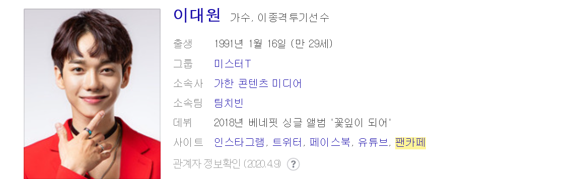 일단 이대원 팬카페 보기전에 보는 프로필을 간단하게 보도록 할께요. 이대원의 출생, 나이, 그룹, 소속사, 소속팀, 그리고 다양한 인스타그램이나 트위터 등등 이동을 한번 가보도록 하겠습니다.